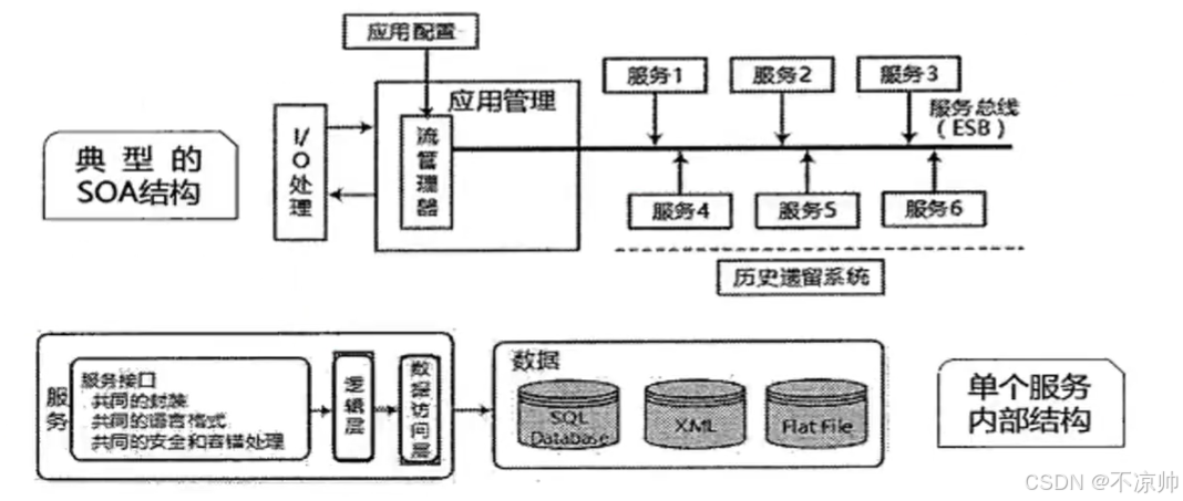 SOA模型中,所有的功能都被定义成了独立的服务 ,所有的服务通过企业服务总线(ESB)或流程管理器来连接。这种松散耦合的结构使得能够以最小的代价整合已经存在的各种异构系统。