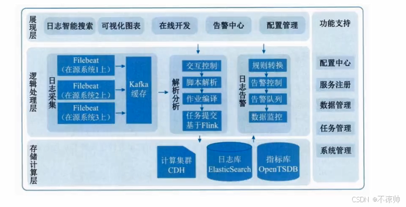 (1)日志采集:用统一的数据处理引擎 Filebeat 实时采集日志并推送给 Kafka 缓存。
