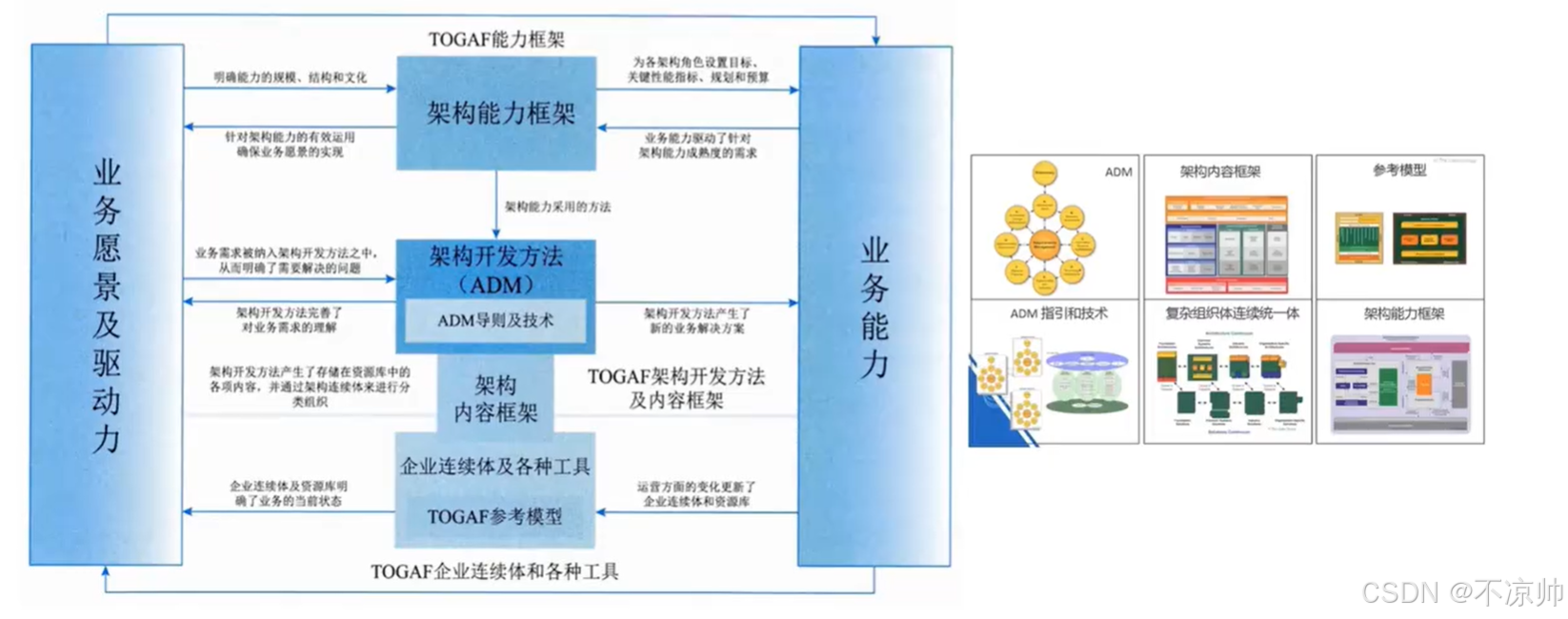 ④企业连续体和工具 :这部分讨论分类法和工具,用于对企业内部架构活动的输出进行分类和存储。