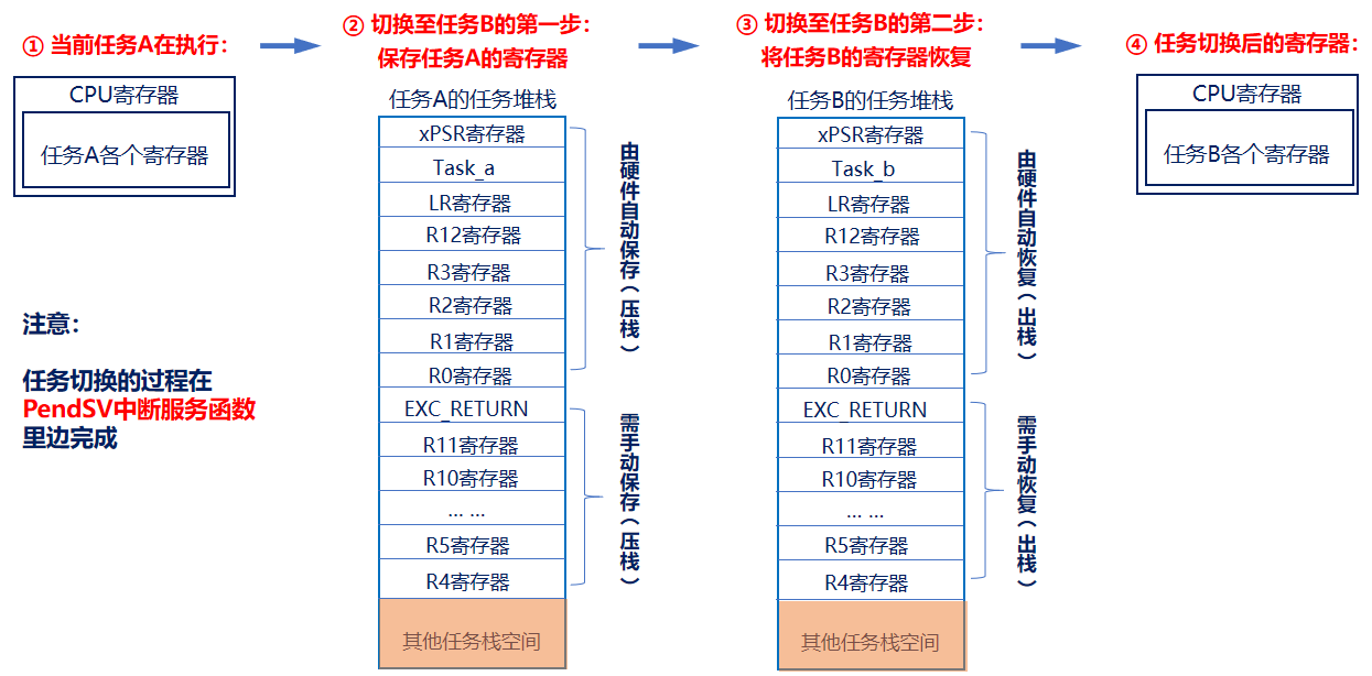 - OS 用汇编代码手动压栈 R4--R11,并将当前堆栈指针(SP)存入该任务的控制块(TCB)。