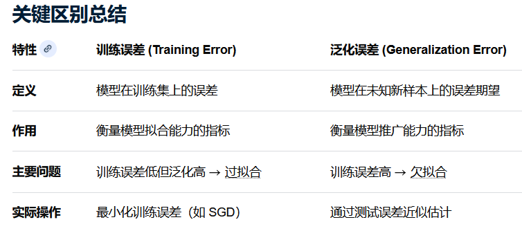 训练误差(Training Error)是模型在训练集上的平均损失,反映模型对已知数据的拟合程度;泛化误差(Generalization Error)是模型在未见新数据上的期望误差,衡量模型的推广能力。