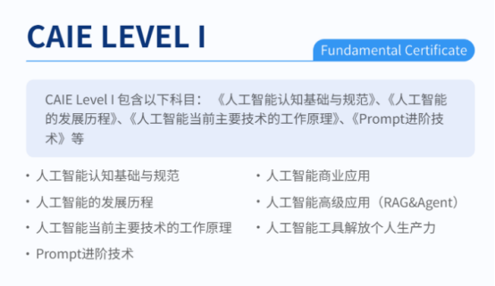 CAIE认证进阶:通过Level I考试获取证书,借助千余家企业(华为、阿里等)背书,让AI能力获得标准化认可,同时初步了解Level II场景落地、资源协调相关内容;