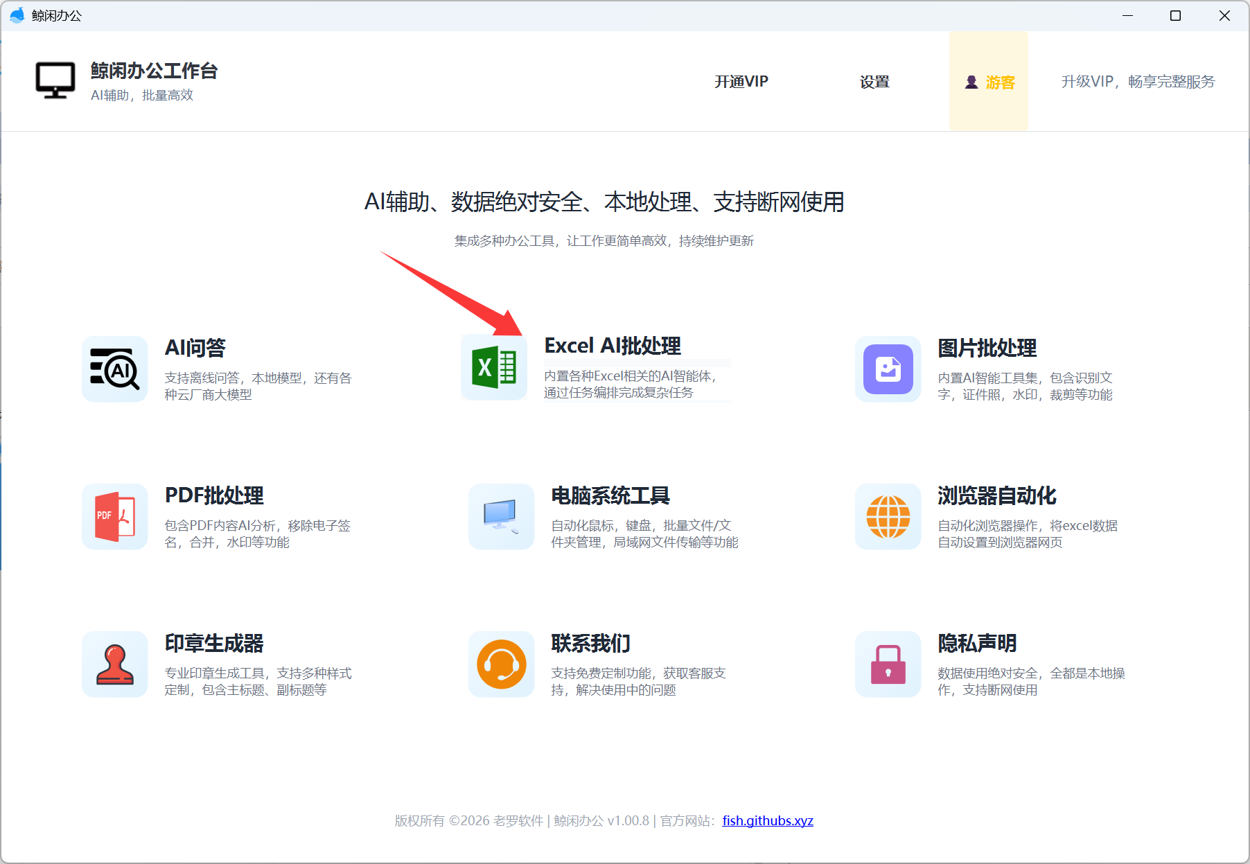这是一个专业AI批处理的解决方案, 支持本地断网使用模型。 首先在主界面上找到 Excel AI批处理: