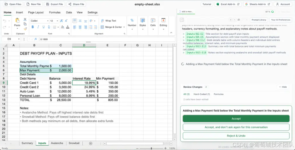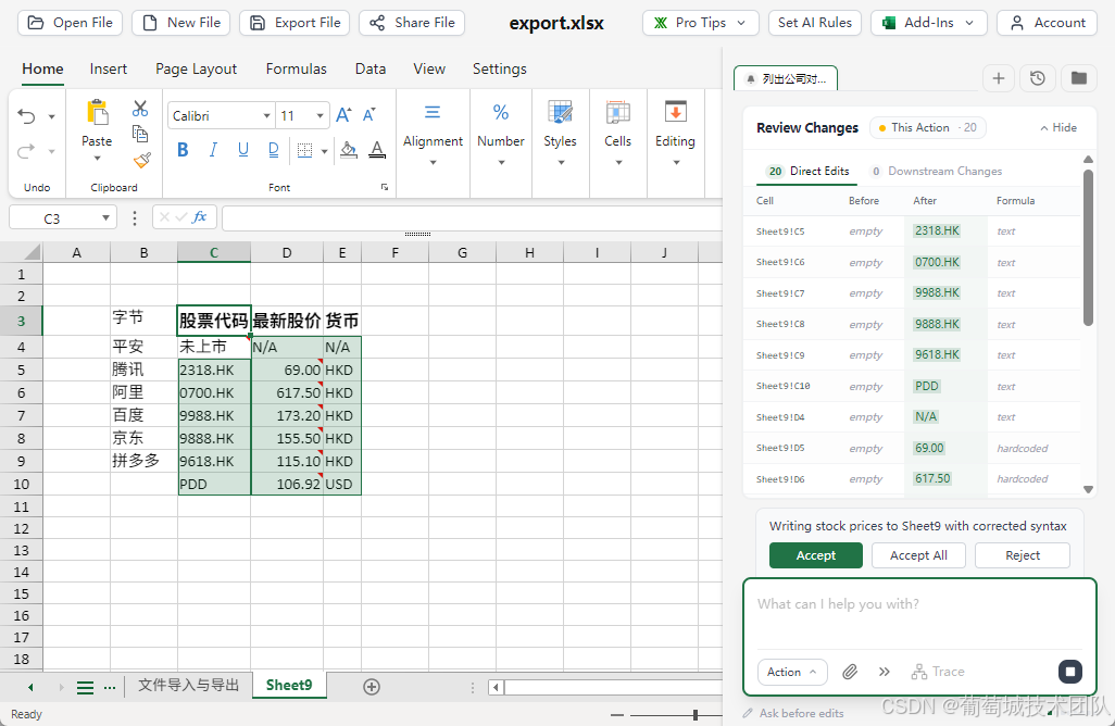 - 技术实现: AI 插件会自动解析当前表格的列名(Header)和数据结构,将其翻译成精准的公式字符串并填充到目标单元格。