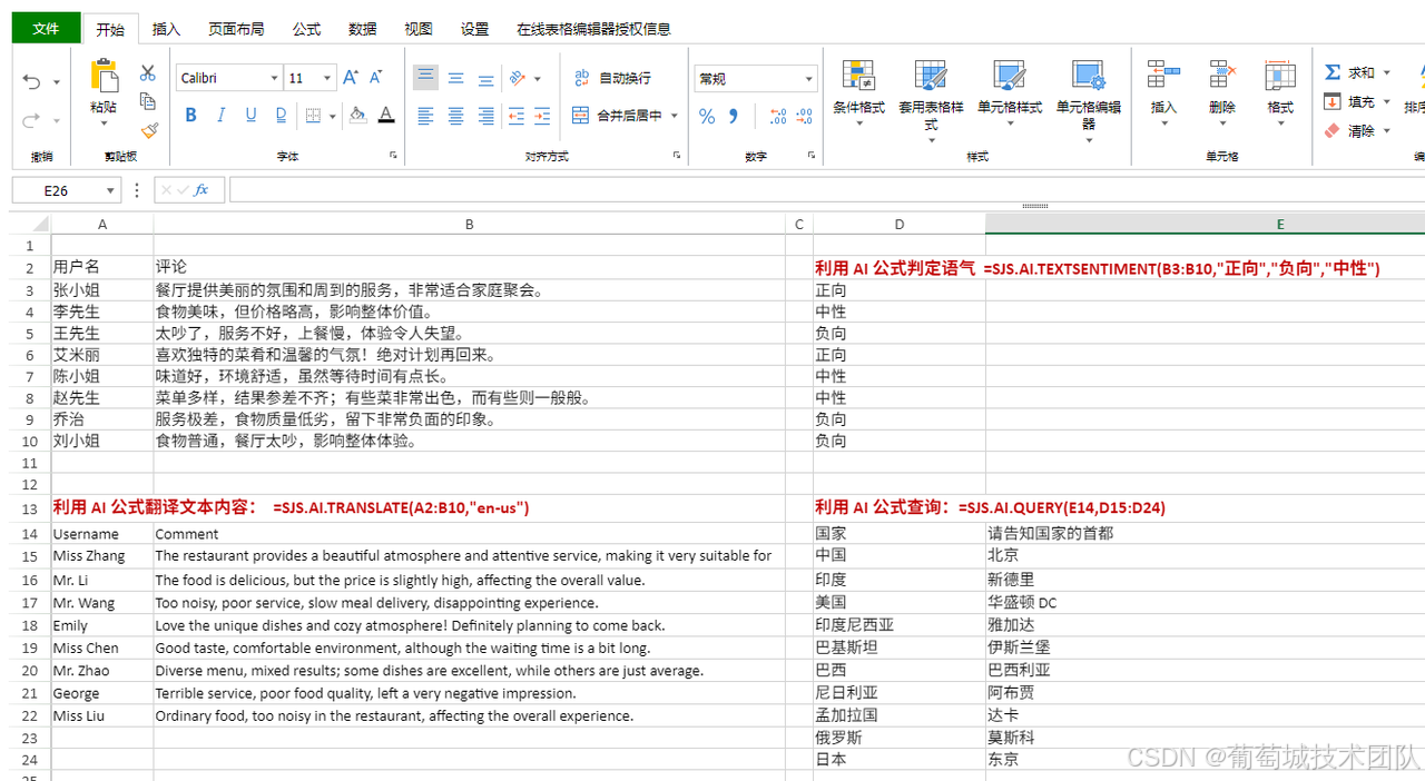 =AI("分析这段用户反馈的情绪偏好", A2)=AI("根据 B 列的公司名称,从互联网抓取其最新的融资轮次", B2)