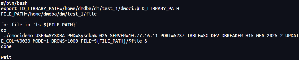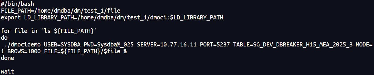 编译完成后会生成dmocidemo程序,然后修改paralle_load.sh脚本中的并行参数以适配当前环境的CPU核心数,确保每个线程独立操作不同的数据文件。同时配置LD_LIBRARY_PATH指向达梦OCI库路径,保证dmocidemo程序正常调用。