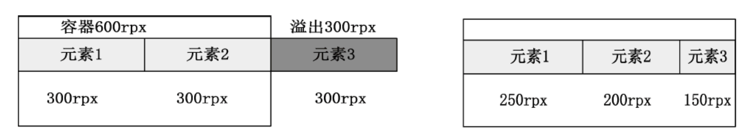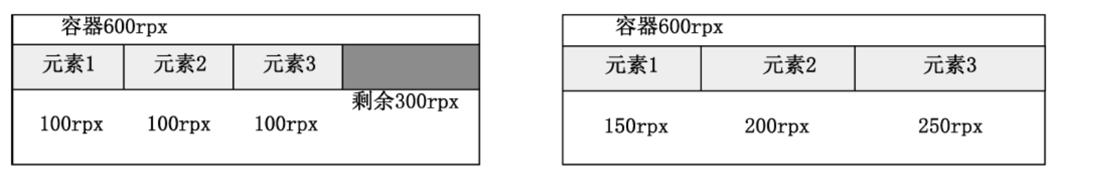 假设父容器宽度为600rpx,3个项目的宽度均为100rpx,会导致剩余空间为300rpx,现计算每个容器被扩张后的实际长度。