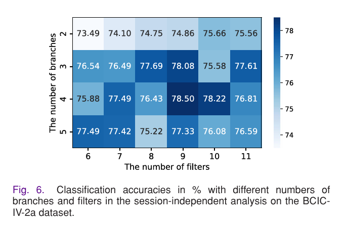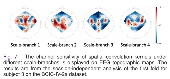 MSST 模块的分支数直接决定多尺度特征的覆盖范围,实验测试了 2-5 个分支的配置,结果显示:4 个分支为最优配置(卷积核尺寸 15、31、63、125),搭配 9 个滤波器时,模型在 BCIC-IV-2a 上达到 78.50% 的精度。当分支数少于 4 时,模型无法捕捉到足够的多尺度频率特征;当分支数增至 5 时,引入了冗余特征,导致模型过拟合,精度反而下降。同时,对不同分支的空间卷积核权重进行脑电拓扑图可视化,发现 4 个分支能分别激活运动皮层的不同区域,对应不同肢体运动想象的 ERD/S 特征,证明多尺度分支的设计与脑电生理特征高度契合。