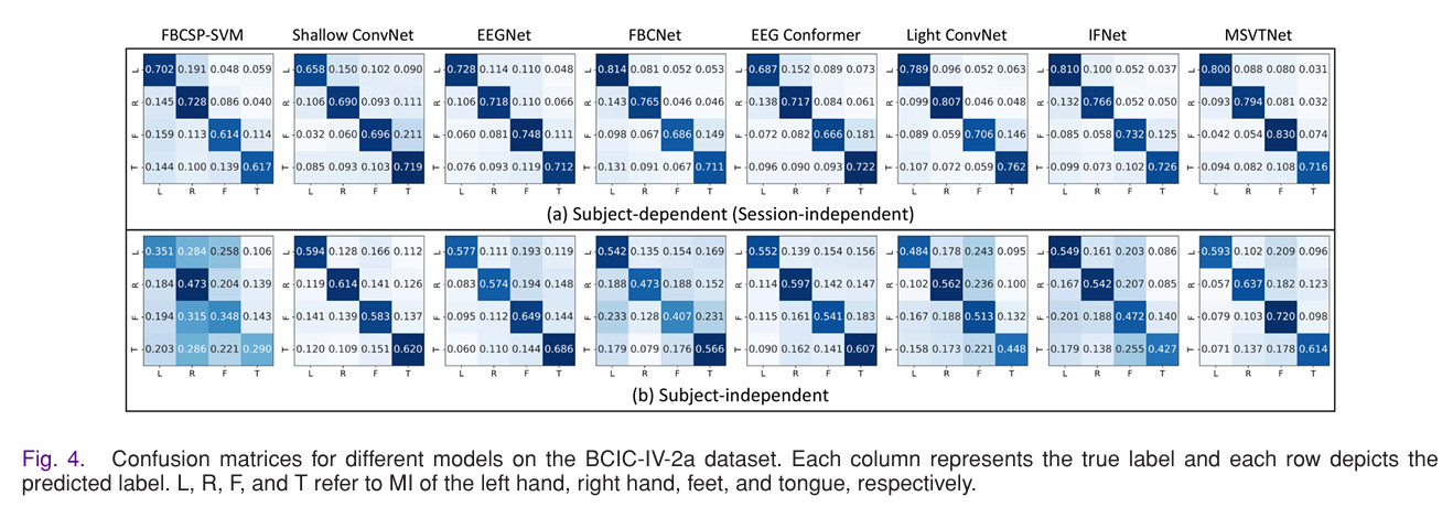 - 以 BCIC-IV-2a 数据集为例,MSVTNet 在会话独立和受试者独立分析中,均实现了四类运动想象任务(左手、右手、双脚、舌头)的均衡分类。其中,双脚运动想象作为传统模型的难分任务,MSVTNet 的解码精度得到显著提升;