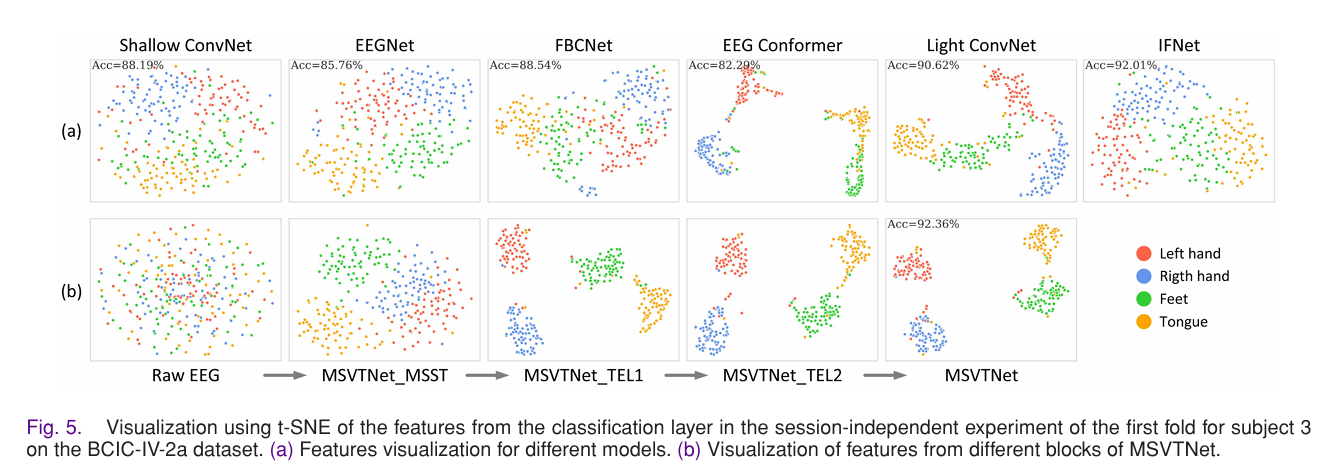- 同时,对 MSVTNet 不同模块的特征可视化发现,从原始 EEG 到 MSST 模块、再到 CSGT 模块,特征的区分性逐步提升,证明模型的多尺度特征提取与跨尺度全局时序编码,能持续挖掘更具判别性的 EEG 特征,为最终分类提供坚实基础。