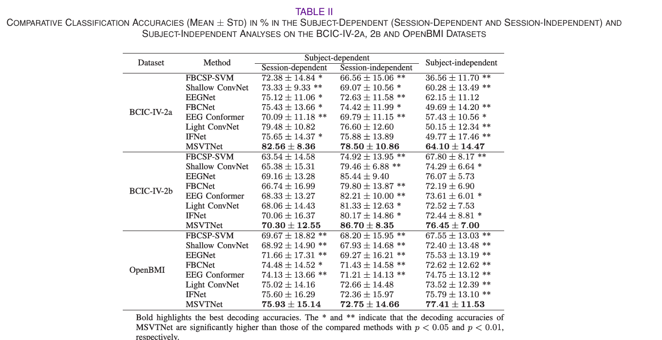 在 BCIC-IV-2a、BCIC-IV-2b 和 OpenBMI 三个公开数据集上的实验表明,MSVTNet 在被试内和被试间设置下均取得了优于多种主流方法的性能表现,尤其在跨被试泛化任务中优势明显。本文将系统介绍模型结构、实验设计以及性能分析,并探讨其在实际脑机接口应用中的潜力。