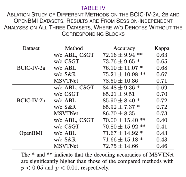 - 移除 ABL 模块后,MSVTNet 在 BCIC-IV-2a、BCIC-IV-2b、OpenBMI 上的精度分别降至 76.10%、85.90%、71.67%,均实现统计显著性下降(p<0.05)。