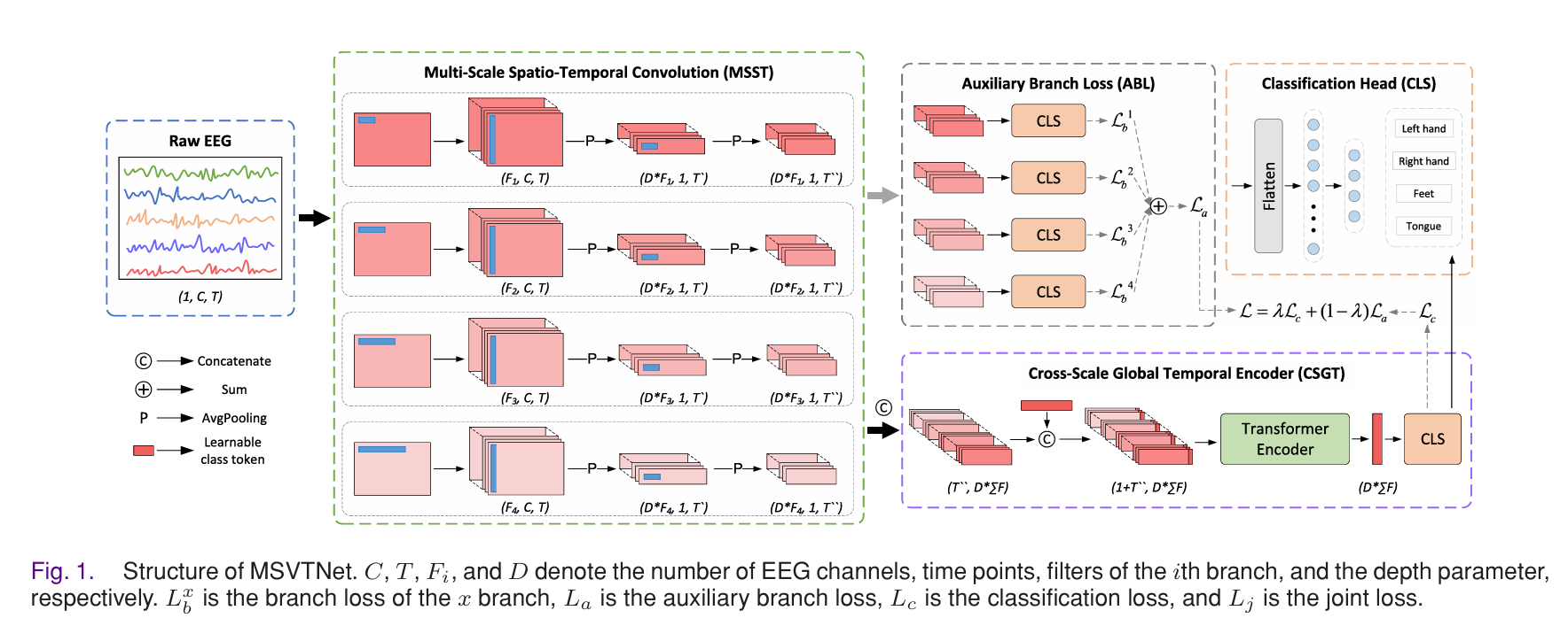 为同时解决 MI-EEG 解码中的多尺度建模不足与全局依赖建模能力有限的问题,MSVTNet(Multi-Scale Vision Transformer Neural Network)构建了一种 多分支卷积 + 全局 Transformer 编码 + 多分支联合监督 的混合架构。