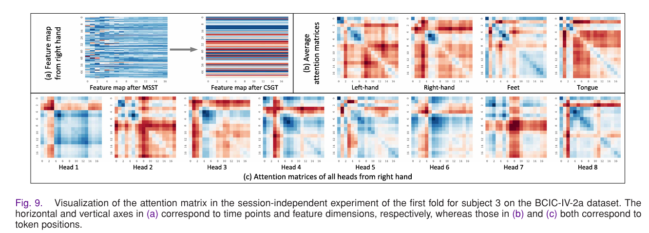 - 同时,四类运动想象任务的注意力矩阵存在明显差异,证明模型能学习到不同任务的独特时序特征。
