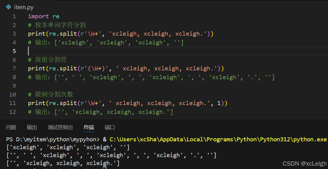 # 输出:['', ' ', 'xcleigh', ', ', 'xcleigh', ', ', 'xcleigh', '.', '']