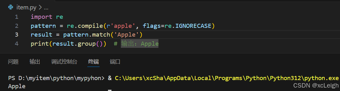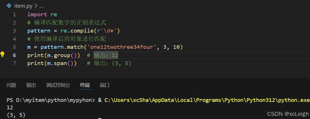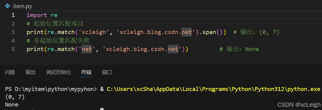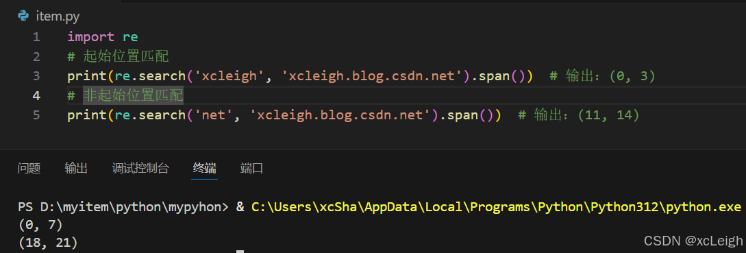 print(re.search('xcleigh', 'xcleigh.blog.csdn.net').span()) # 输出:(0, 3)