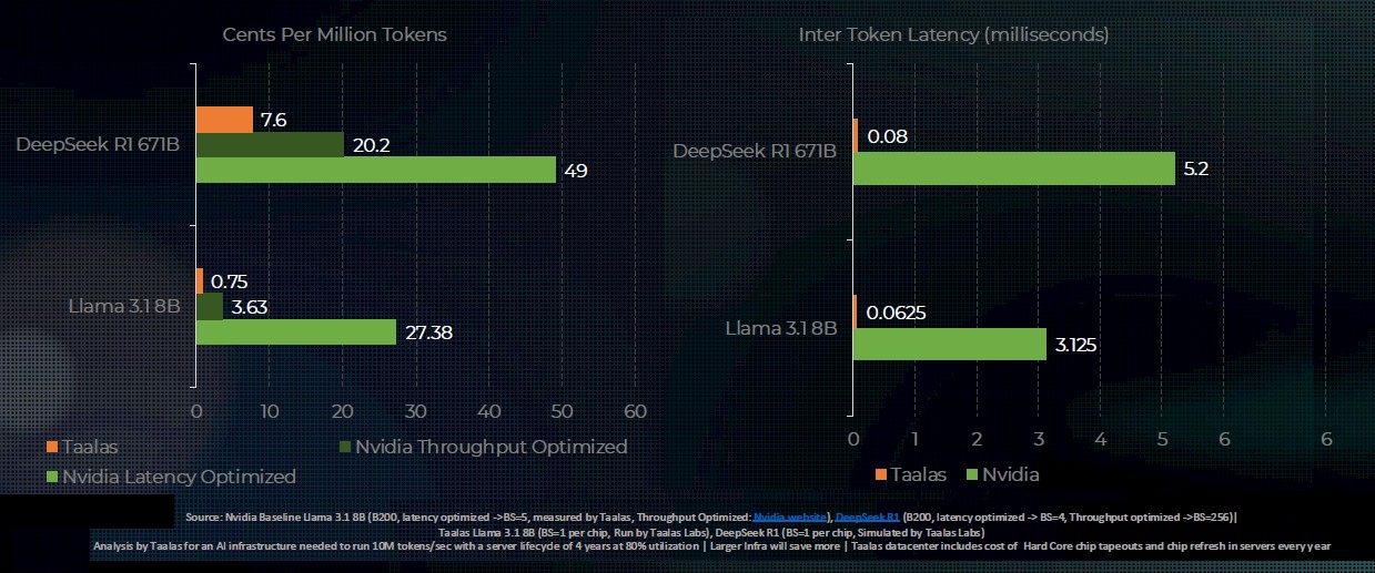 从测试结果来看,Taalas 在这两款机型上都展现出了更低的成本和更低的延迟。
