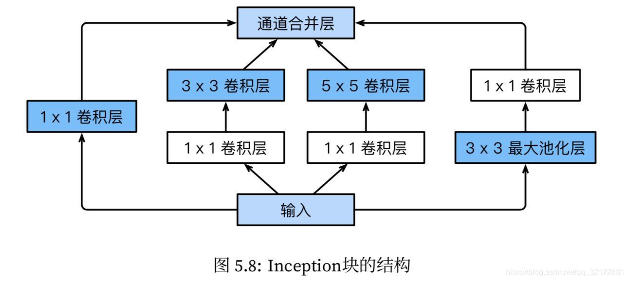 GoogLeNet的inception模块的出现更是对传统CNN卷积层的超级进化,它前面的网络结构(Lenet到NiN)的卷积块都是由1层或多层连续的顺序的卷积层且只用同一个尺寸的卷积核进行卷积操作,而inception模块对输入并行接不同尺寸的卷积核,最后把特征图合并,这个是新的创新、新的尝试,如李沐等人写的《动手学深度学习》书中的图,如下所示。