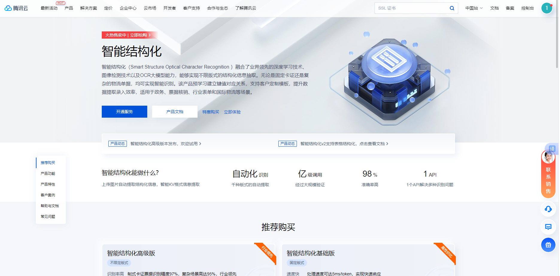 腾讯云智能结构化OCR产品提供基础与高级版本 ,这里我们以高级版进行体验演示,下面放几个OCR体验、说明与特惠活动的链接: