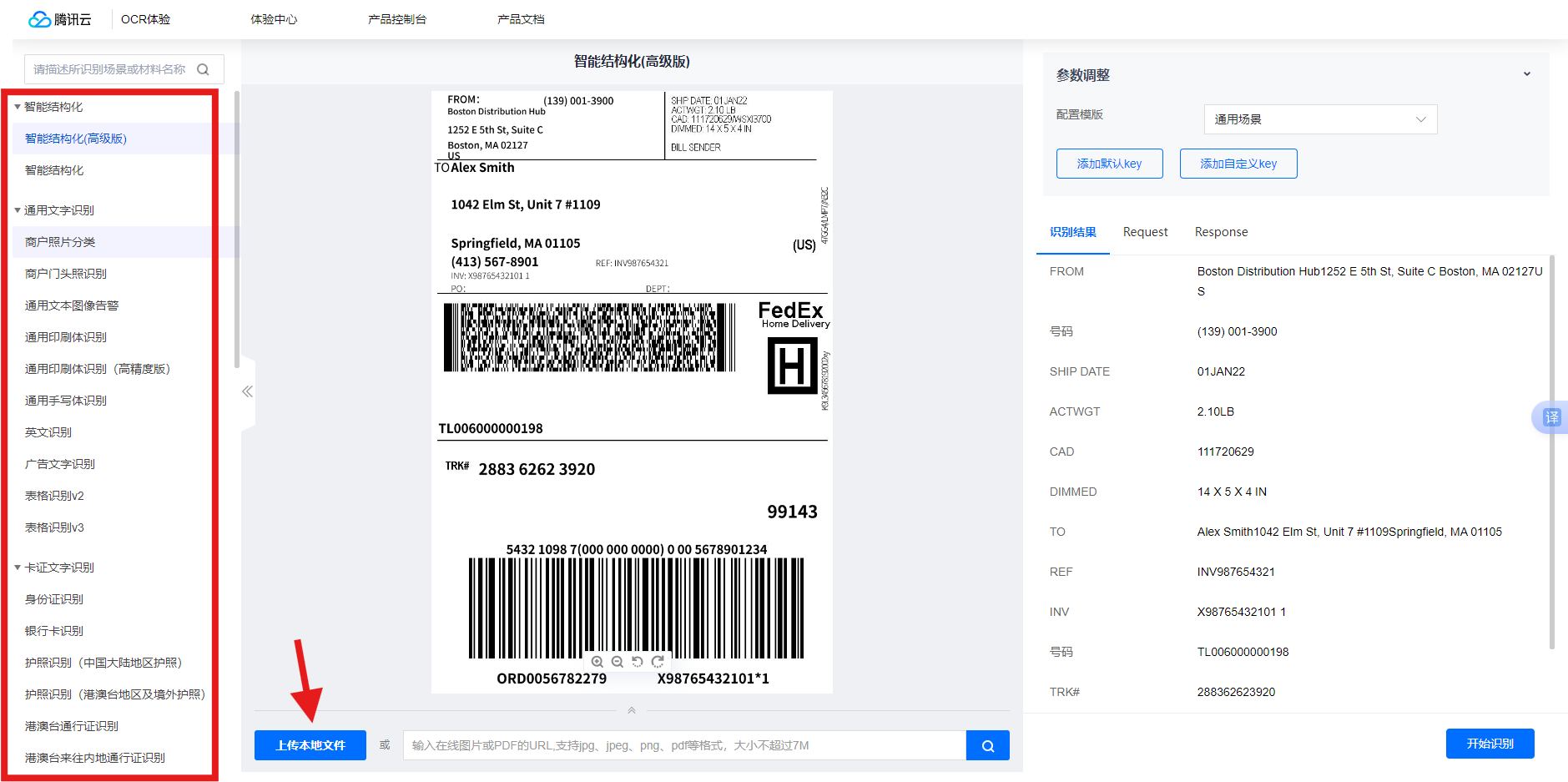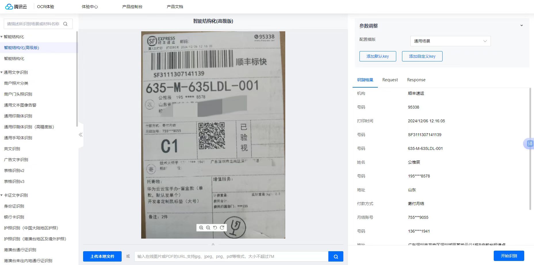 我们从产品demo体验链接进来之后,会发现界面如下图所示,左边的菜单栏会有很多选项,比如:智能结构化、商户门牌照识别、身份证识别、二维码识别等,能够体验的功能是非常多的。这里我们讨论的是OCR在物流行业中的应用,我们就以快递物流信息为例,进行测试。
