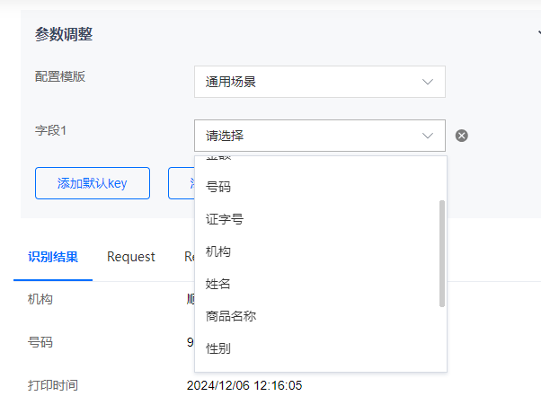 如果它的结果不符合你的预期或者不符合你想要的格式,那么我们可以进行参数调整,在右上角会有参数调整,模板有很多选择:海运提单、国际invoice等,如果把它调整为这种专业的模板在格式信息上可能更准确。如果只需要查找一个或者几个字段,适用于在物流单中提取有用的信息。可以选择添加默认key,这样下拉列表会有很多key供你选择,如果没有自己想要的key,可以自己自定义添加模板中的字段。