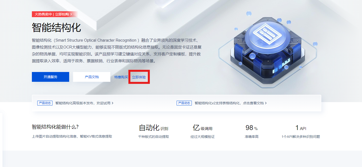 首先,我们可以选择从产品官网/文档链接进入,进入界面选择立即体验,如下图所示:
