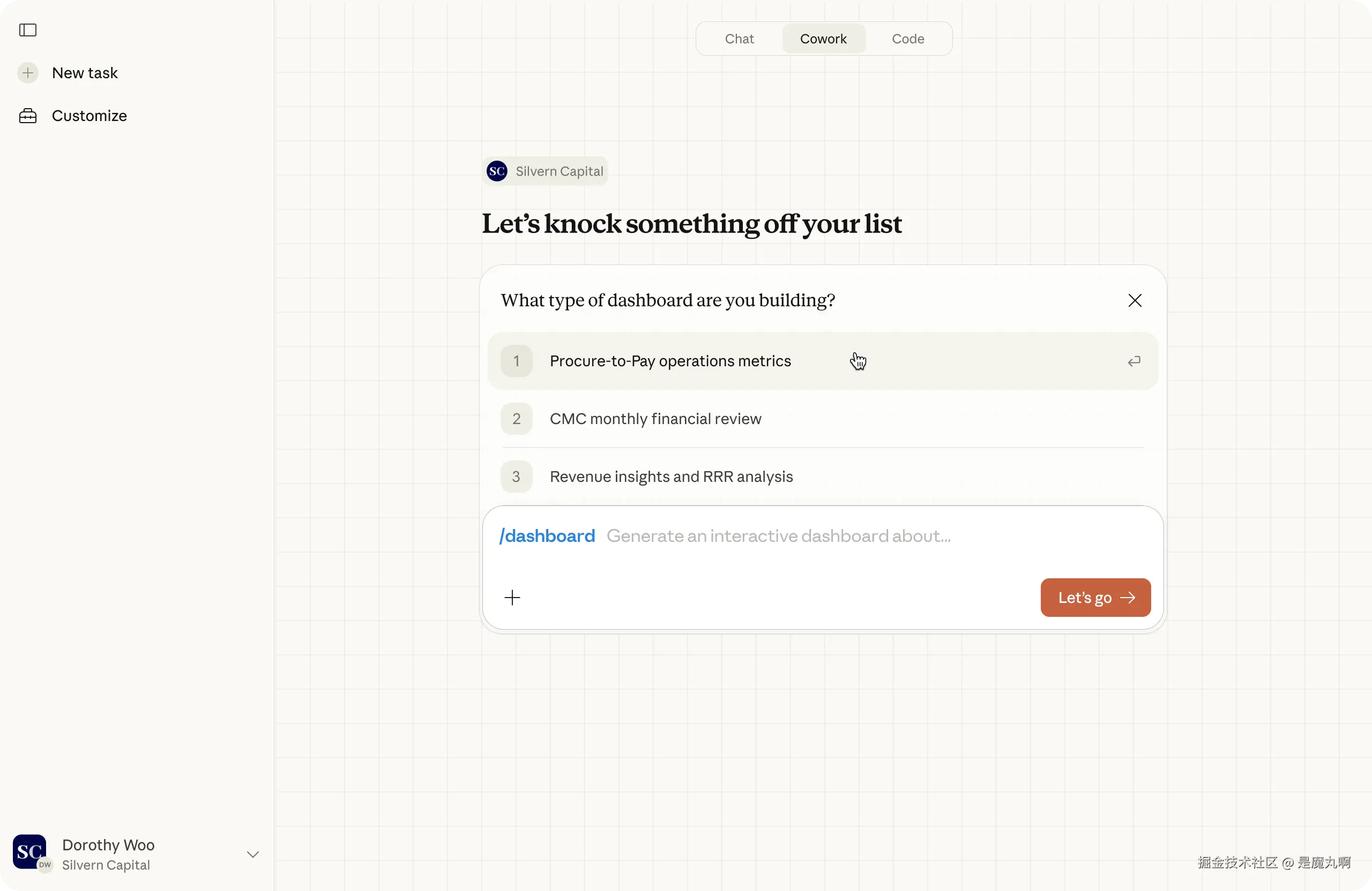 在用户方面,slash commands 现在以结构化 forms 启动,因此运行"generate report"或"dashboard"等 workflow 感觉就像填写 brief 一样直观。Cowork 现在还全面包含 company branding,包括为您的组织量身定制的重新设计的 home 体验。