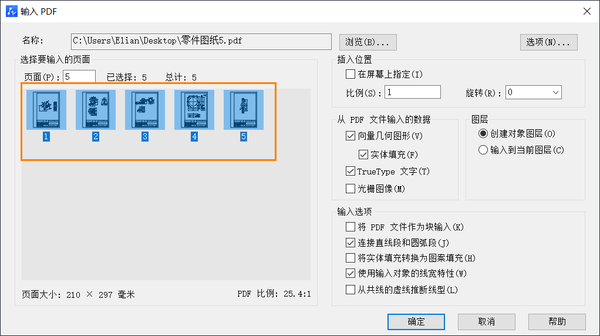 ② 选择要导入的页,支持ctrl多选或者shift连选,然后可以修改一些选项,如【比例】、勾选【从PDF文件输入的数据】类型等,点击【确定】;