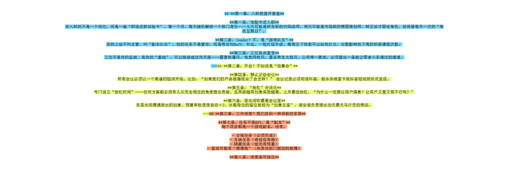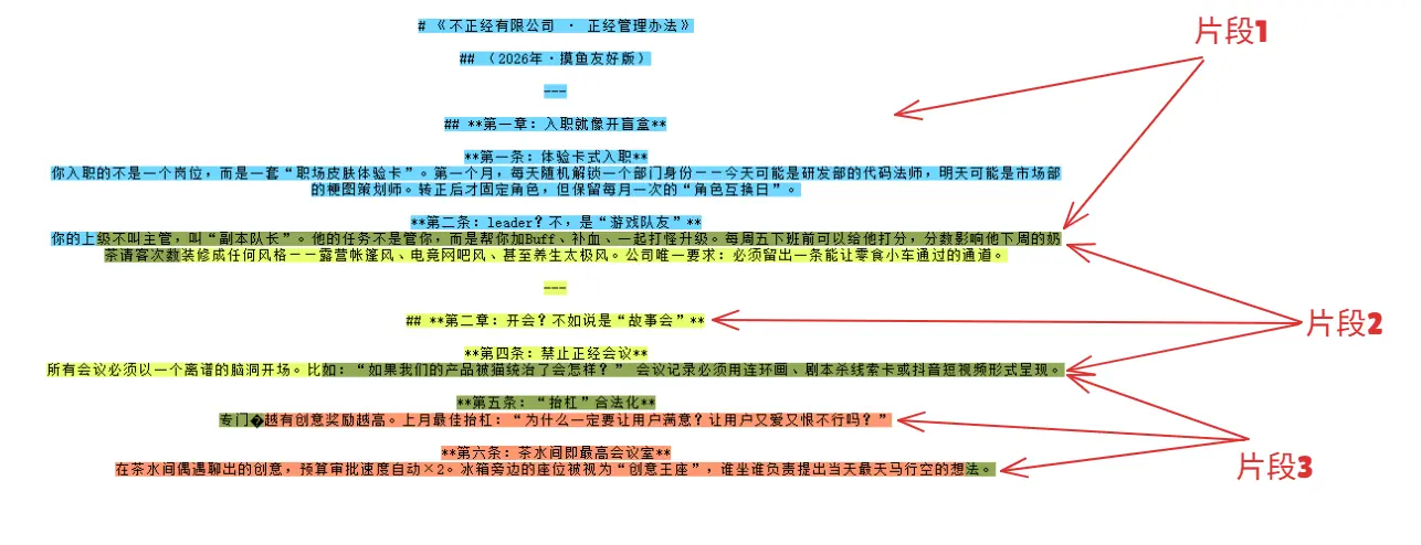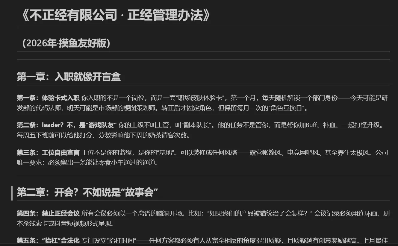 这里,我使用AI创建了一版大概大约2700字的《不正经有限公司 正经管理办法》,里面全是稀奇古怪的公司条例,用来后续验证我们的RAG是否生效。