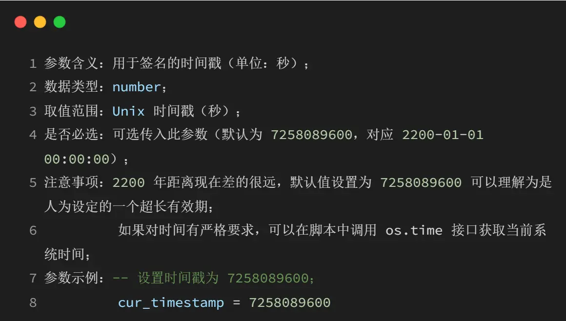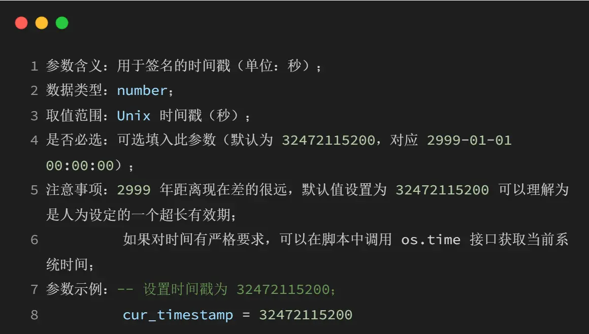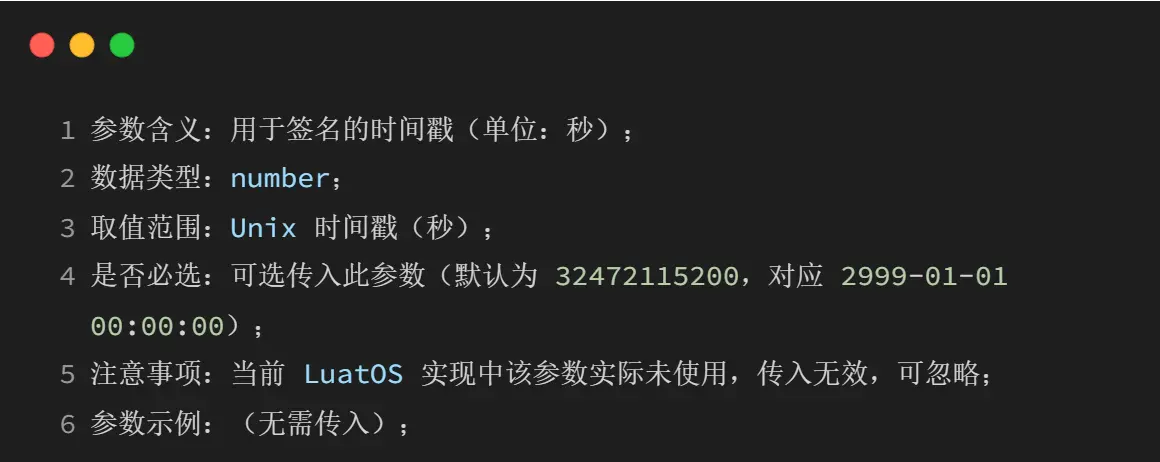 时间戳 cur_timestamp 参数在当前 LuatOS 实现中默认为 32472115200,无需传入;