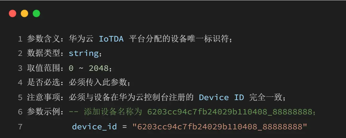 华为云 IoTDA 使用 device_id(而非 ProductKey + DeviceName)作为设备唯一标识,格式通常为:node_id + "_" + device_name(如 "6203cc94c7fb24029b110408_88888888");