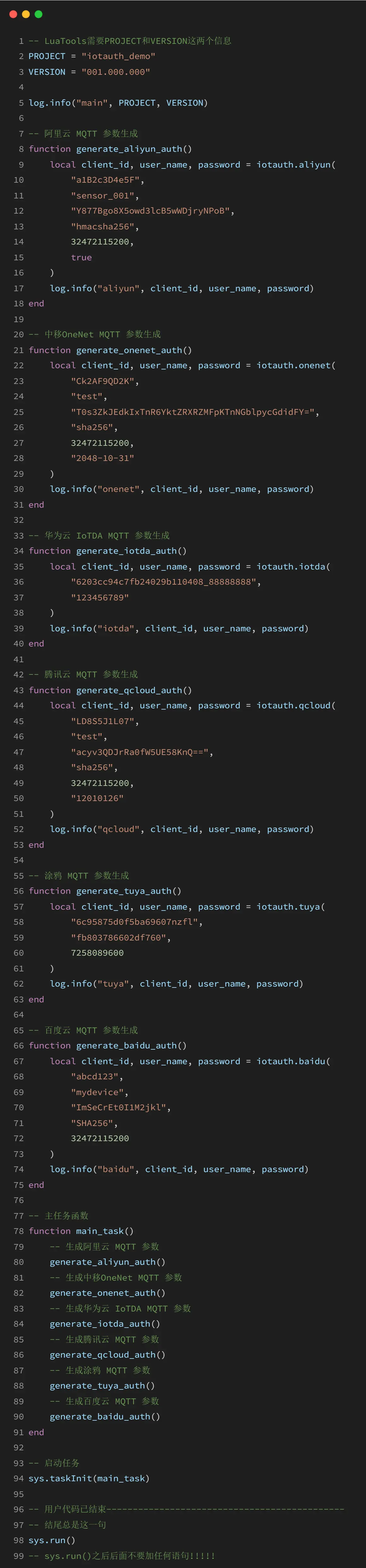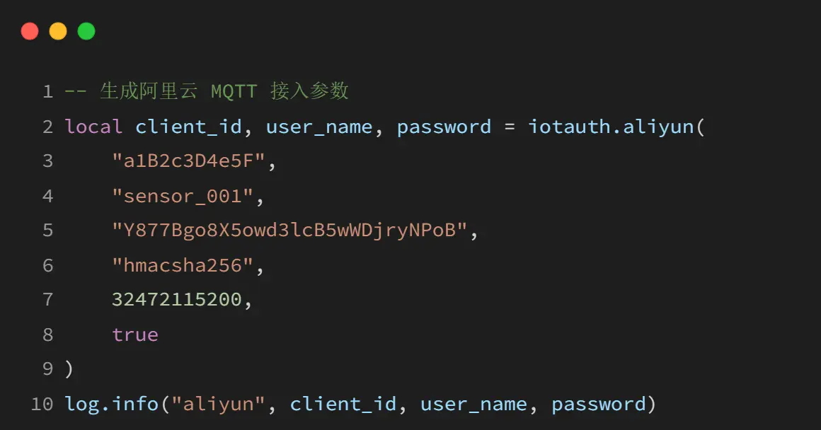 为此,LuatOS 提供了统一的 IoT 鉴权库(iotauth),封装了主流云平台的认证流程。开发者只需传入三元组信息,即可自动计算并生成符合目标平台要求的 MQTT 连接参数,大幅简化设备接入流程,提升开发效率与系统可维护性。