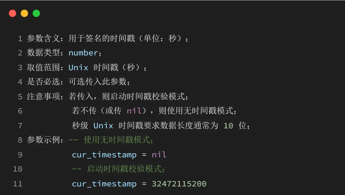 若传入 cur_timestamp,则启动时间戳校验模式,平台将校验时间有效性;若不传,则使用无时间戳模式;