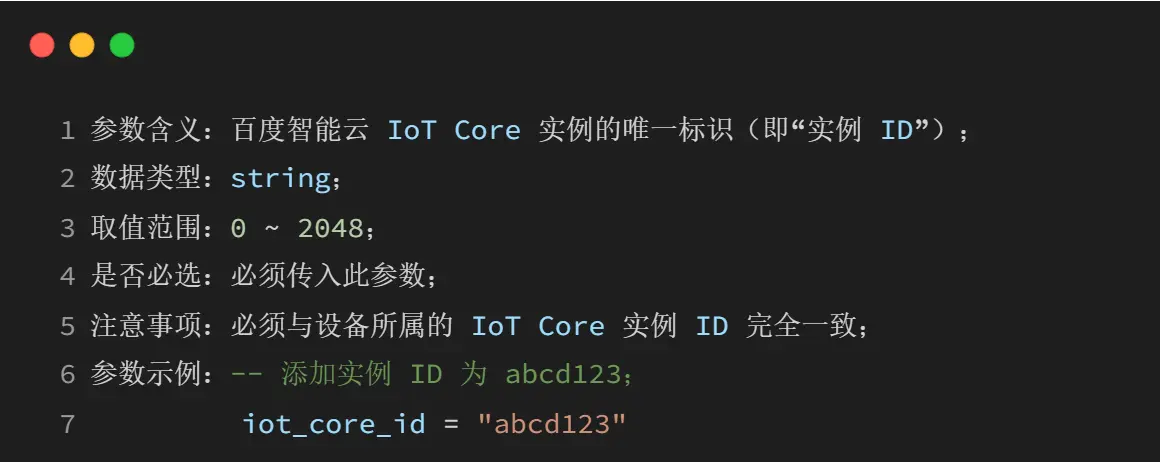 百度 IoT 平台使用 iot_core_id + device_key + device_secret 三元组进行设备身份认证;