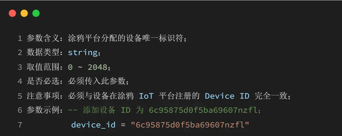 - 涂鸦平台使用 device_id + device_secret 作为设备唯一身份凭证,无需 ProductKey;