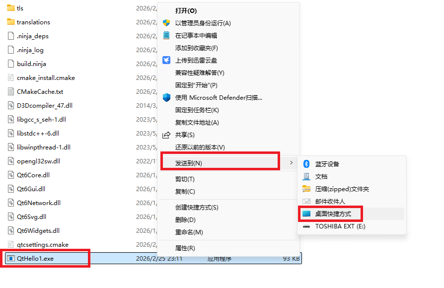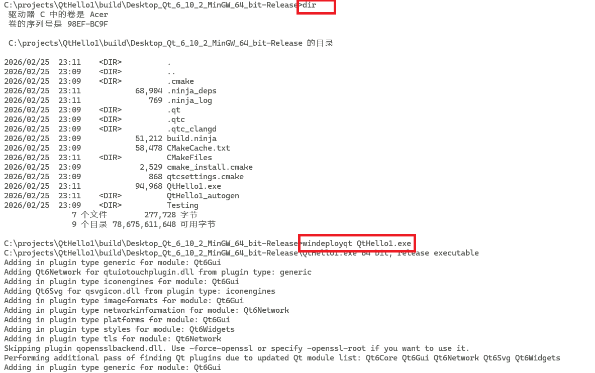 执行命令windeployqt QtHello1.exe