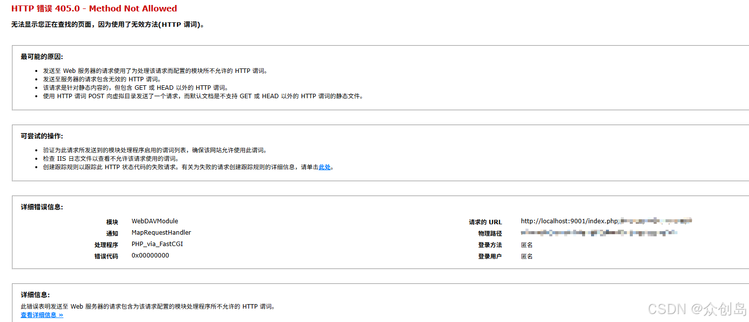 原因是虽然请求已进入 PHP 处理程序(PHP_Via_FastCGI),但被 WebDAVModule 模块拦截,导致返回 405。WebDAV 是 IIS 的一个功能模块,默认会处理 PUT 和 DELETE 请求,即使 PHP 允许这些动词,WebDAV 也可能先于 PHP 执行并拒绝请求。