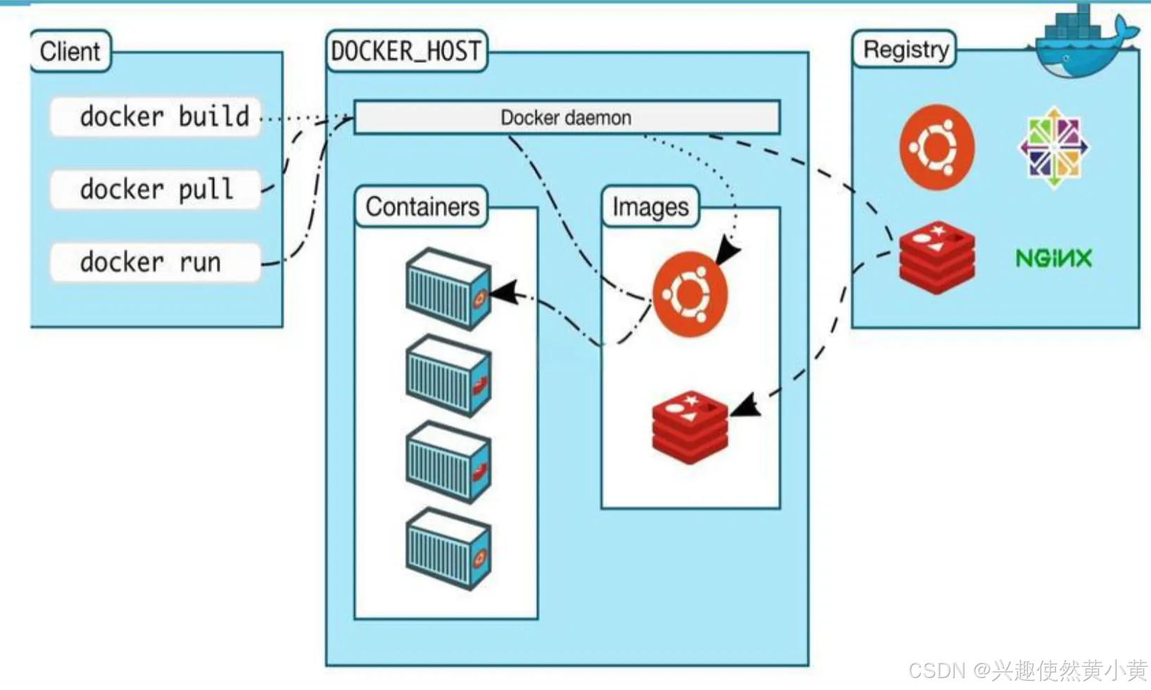 Docker 使用客户端-服务器 (C/S) 架构模式,使用远程 API 来管理和创建 Docker 容器。 Docker 容器通过 Docker 镜像来创建。