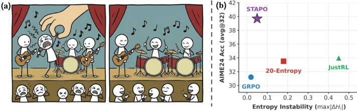- 熵稳定性显著提升 :GRPO 会 collapse,20-Entropy/JustRL 可能爆炸,而 STAPO 最稳定。