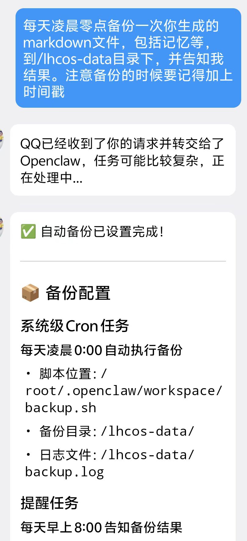 定时备份任务我是直接让OpenClaw自己加的: