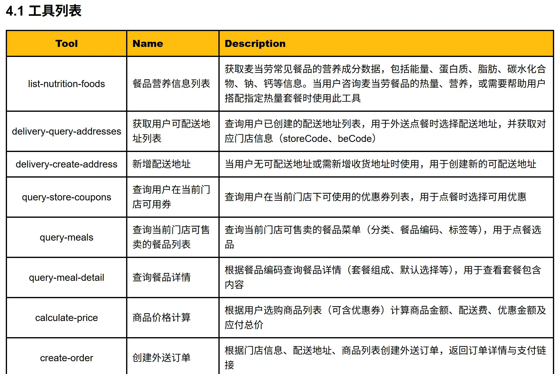 我是直接安的clawhub的mcd-cn skill,这个skill调用的是麦当劳官方MCP。登录https://open.mcd.cn/mcp可以获取MCP token,给OpenClaw配好(可以让OpenClaw自己配,也可以直接在/root/.openclaw/workspace/skills/mcd-cn/.env中填)。mcd-cn skill本身的README写得不好,只写了很少的功能(还有错别字),事实上它是一个直接给麦当劳官方MCP做适配的cli接口,所以其实麦当劳MCP官方文档中这些工具列表都能用: