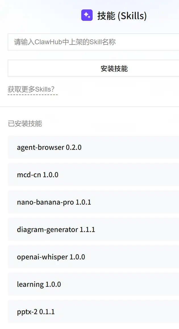 安装好的技能会显示在下面的"已安装技能"中(不从应用管理下的也会显示)。