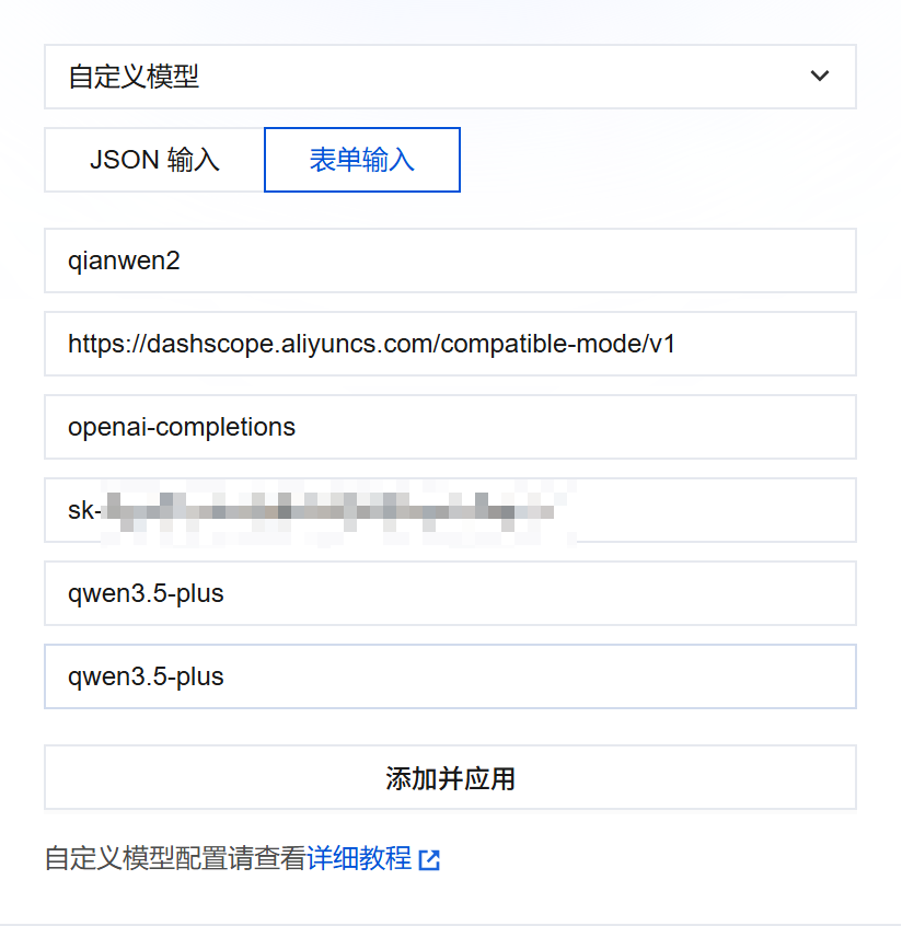 但是我们很容易发现,在应用管理中可以直接添加的模型是有限的,如果想要切换的话,就需要在自定义模型中配置。但需要兼容OpenAI/Anthropic协议。如qwen 3.5 plus,在这里base url就需要填OpenAI SDK支持的URL,而不是HTTP请求的URL: