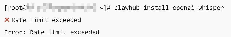 安装失败的效果(原因是速率限制,大概因为OpenClaw太火了,所以clawhub炸了吧):