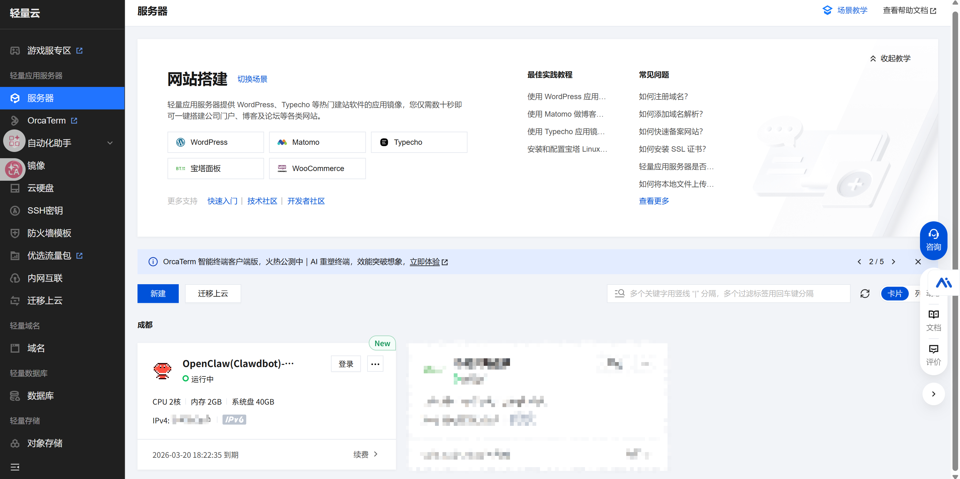 直接从腾讯云轻量应用服务器的应用管理的技能(skills)里安:
