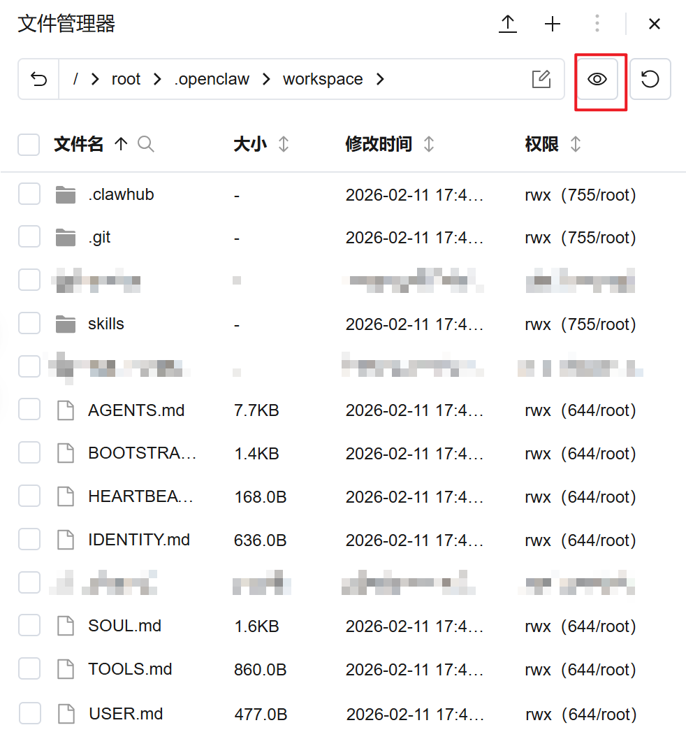 腾讯云OpenClaw文件管理路径在root/.openclaw/workspace下,注意点击右上角的显示隐藏文件: