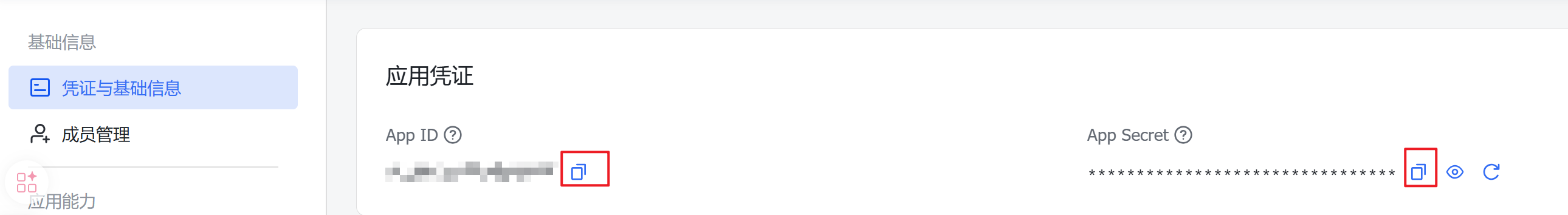 复制应用凭证app id和app secret: