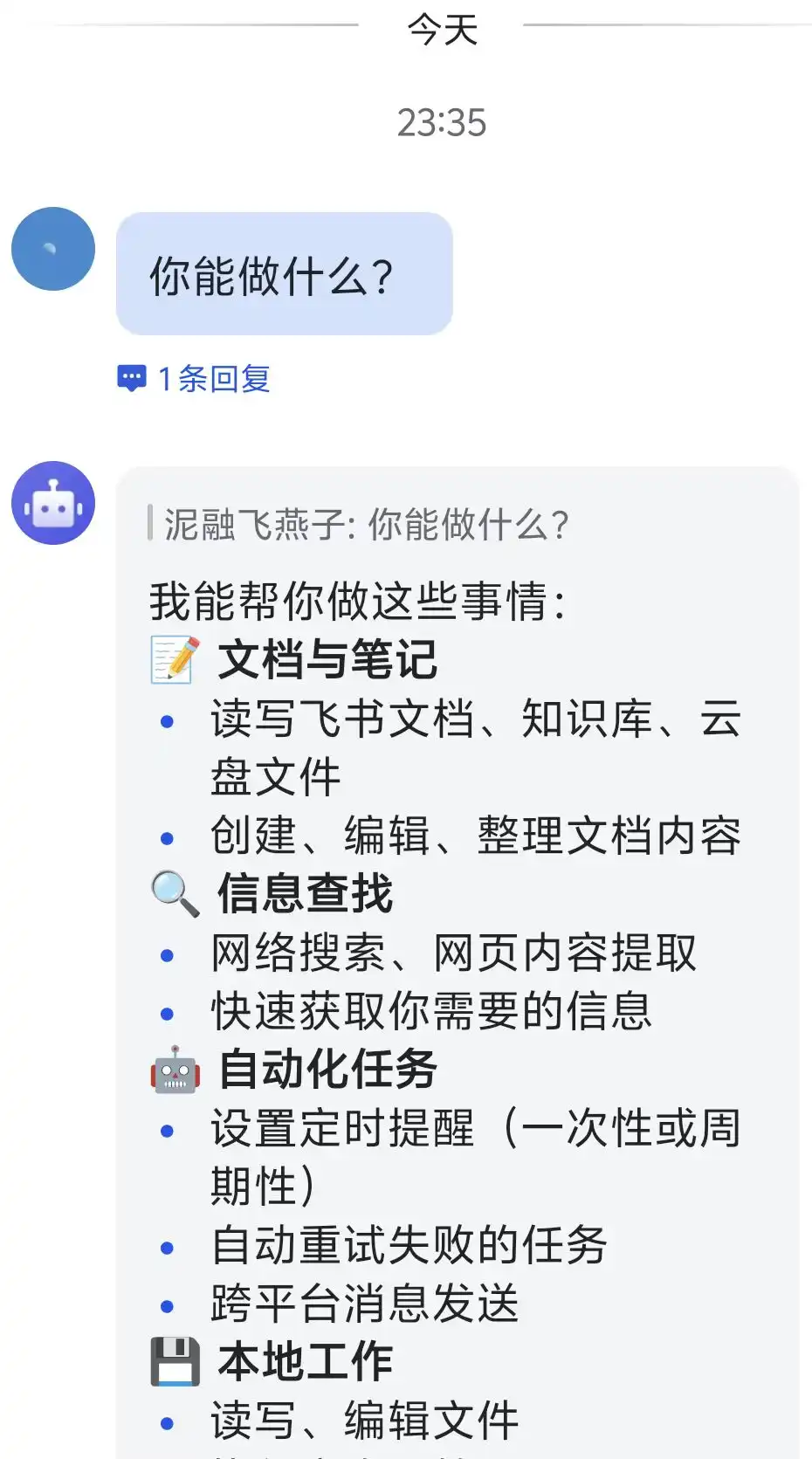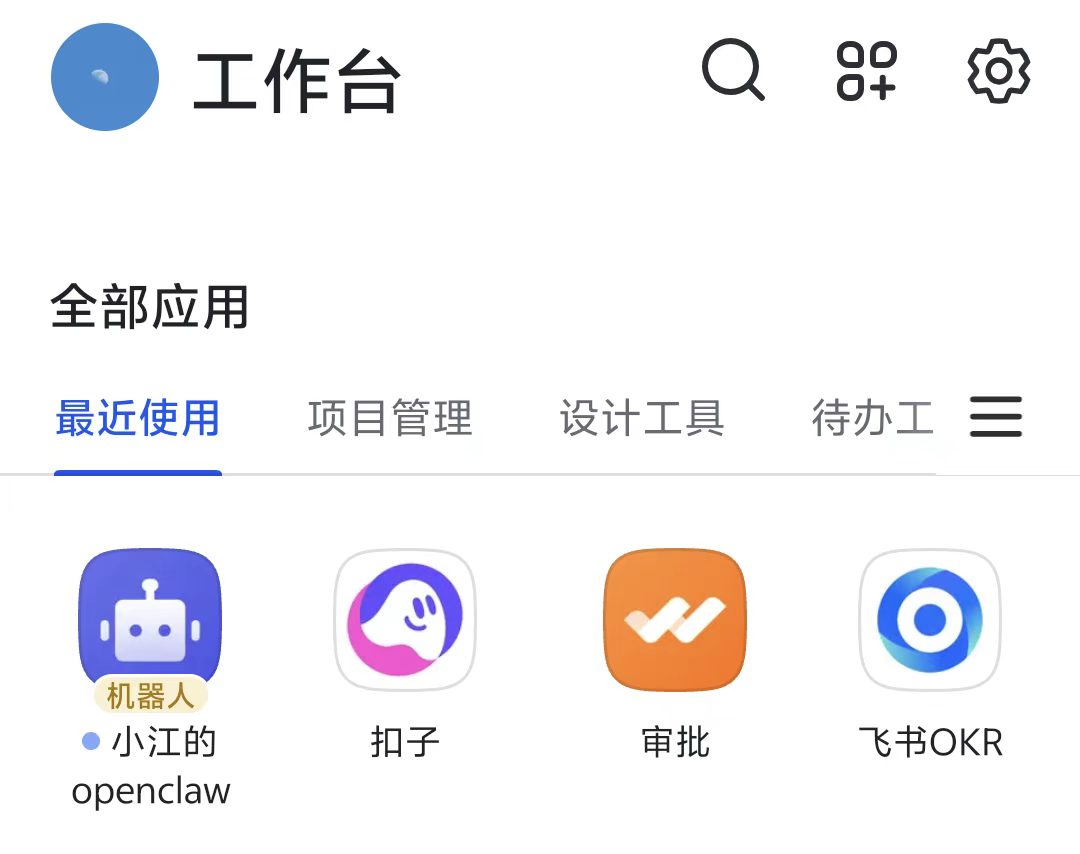 在飞书APP工作台中即可找到机器人: