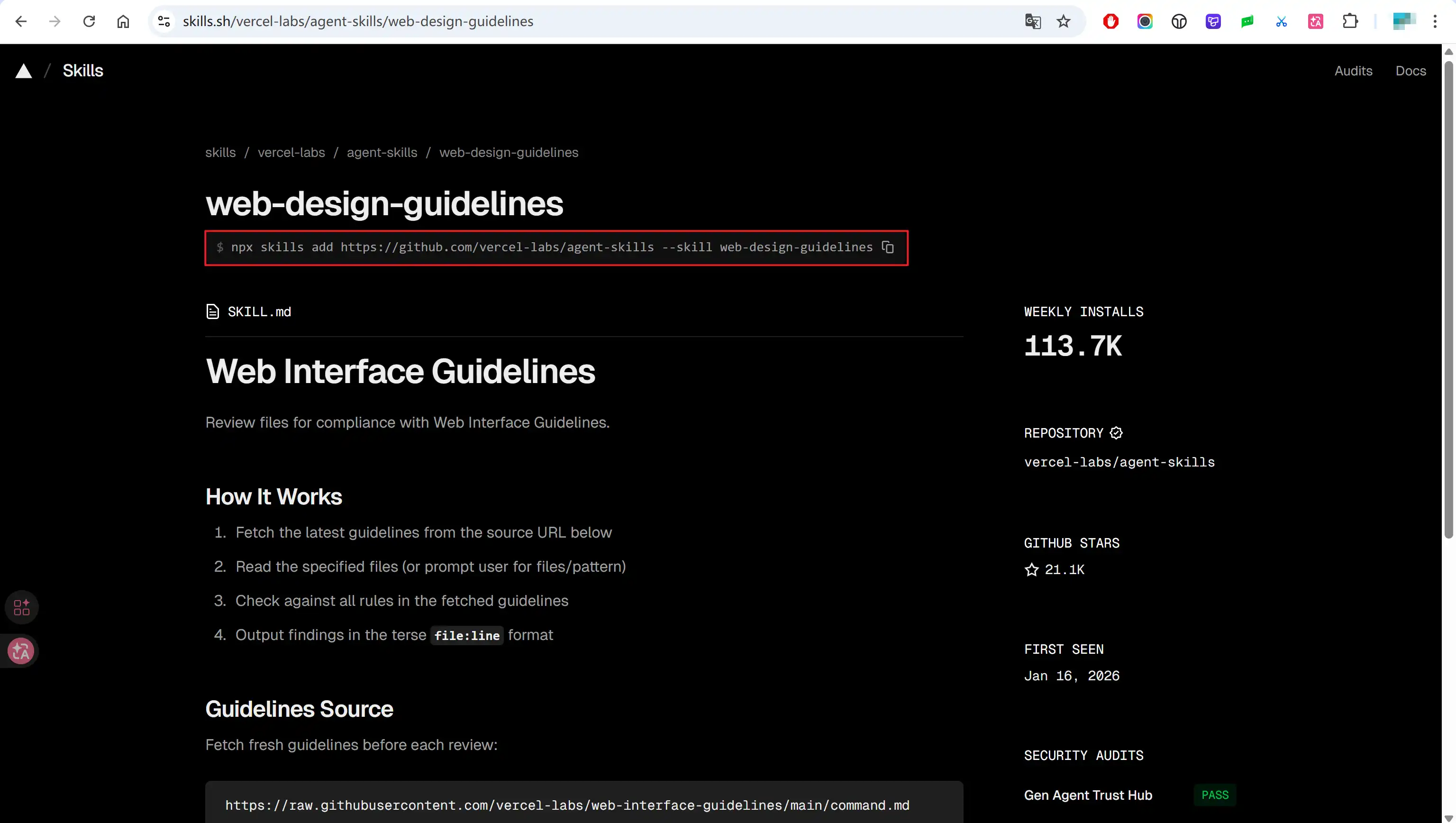 在这个网站里的skill用npx skills add <owner/repo>下载。具体的skill页面中也会显示具体的下载路径,如: