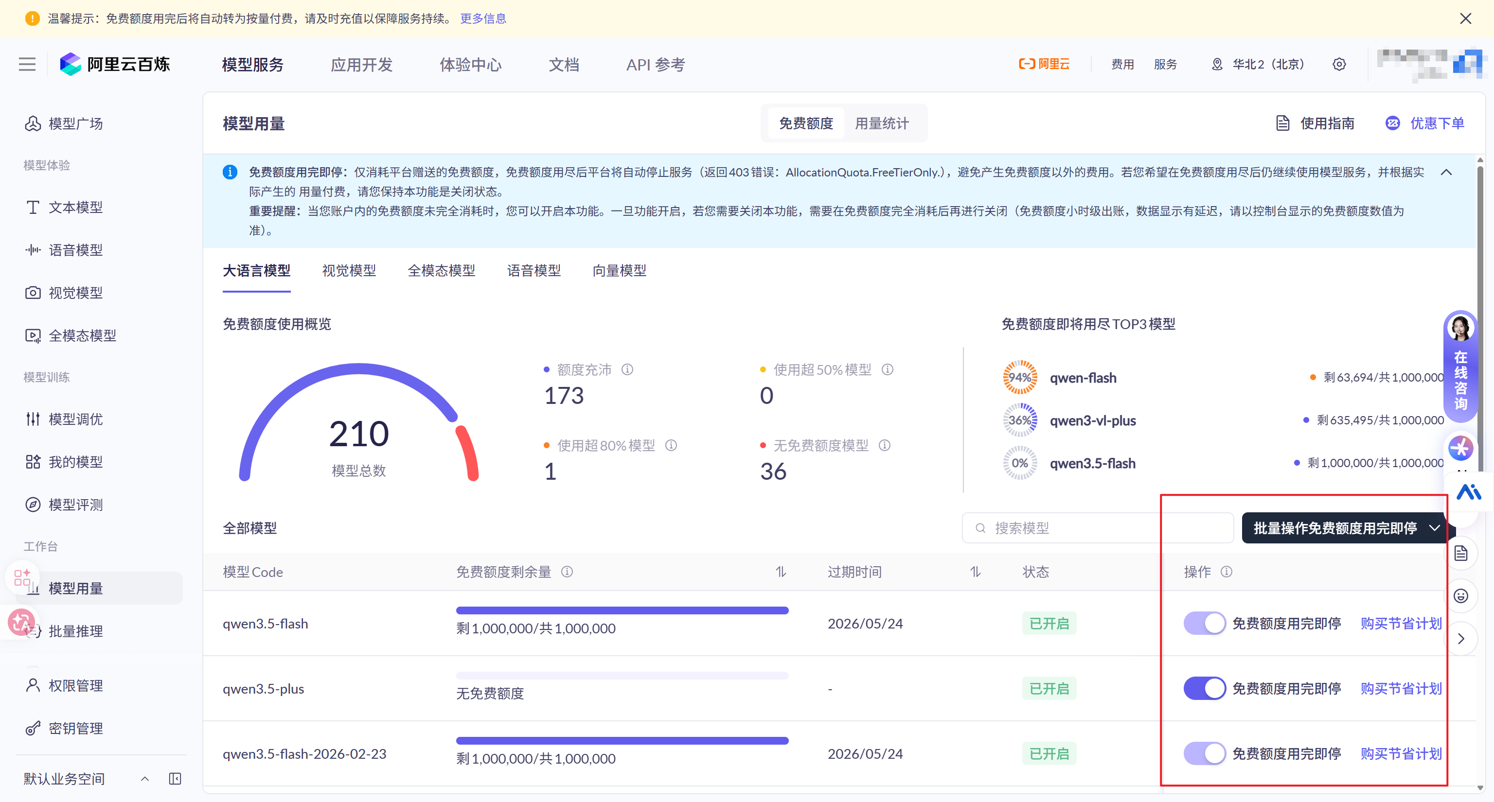 需要注意,如果用的是百炼平台免费开通的额度,一定要在https://bailian.console.aliyun.com/cn-beijing/?tab=model#/model-usage/free-quota中打开免费额度用完即停 :